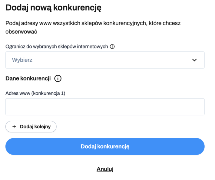 Jednorazowo można dodać od 1 do maksymalnie 10 konkurentów, wpisując każdy adres w osobnym polu i klikając + Dodaj kolejny. Jeśli lista nowych konkurentów została wyczerpana kliknij Dodaj konkurencję.