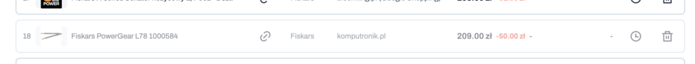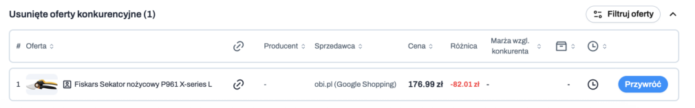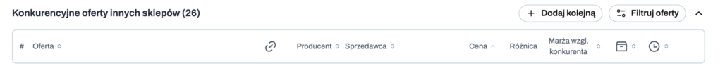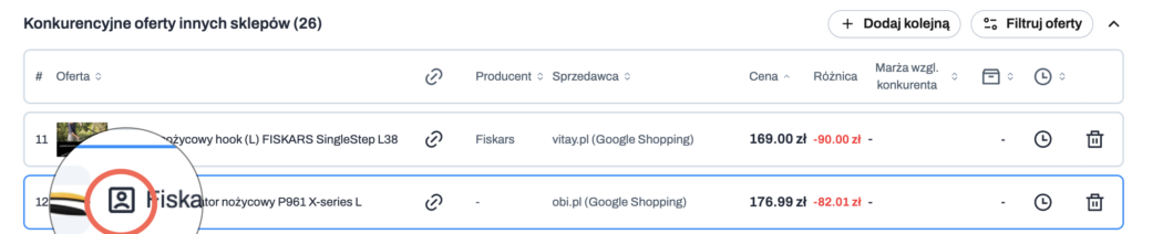 - ikonka kosza: umożliwia usunięcie oferty konkurencji z monitorowania, jeśli jest nieprawidłowa lub nie chcesz jej dalej śledzić