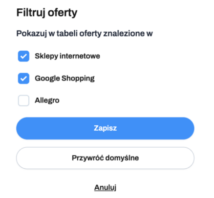 Jeśli monitorujesz konkurencję ze sklepów internetowych, Google Shopping oraz Allegro, możesz wybrać, które źródła chcesz analizować w danym momencie.