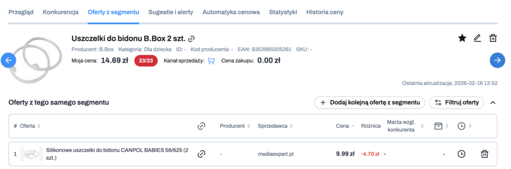 W tej zakładce znajdziesz oferty z tego samego segmentu co Twoja i które mają z nią dużo wspólnego; na przykład: kategorię czy nazwę, ale pochodzą od innego producenta oraz mają inny kod EAN.