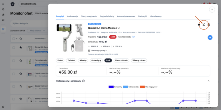 3. Kliknij ikonę ołówka w prawym górnym rogu, na dowolnej zakładce Karty oferty. Otworzy się modal edycji.