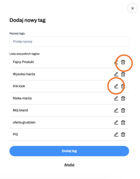 edytować nazwę tagu: kliknij ikonę ołówka obok nazwy (powstanie nowy tag, gotowy do przypisania do wybranych ofert).