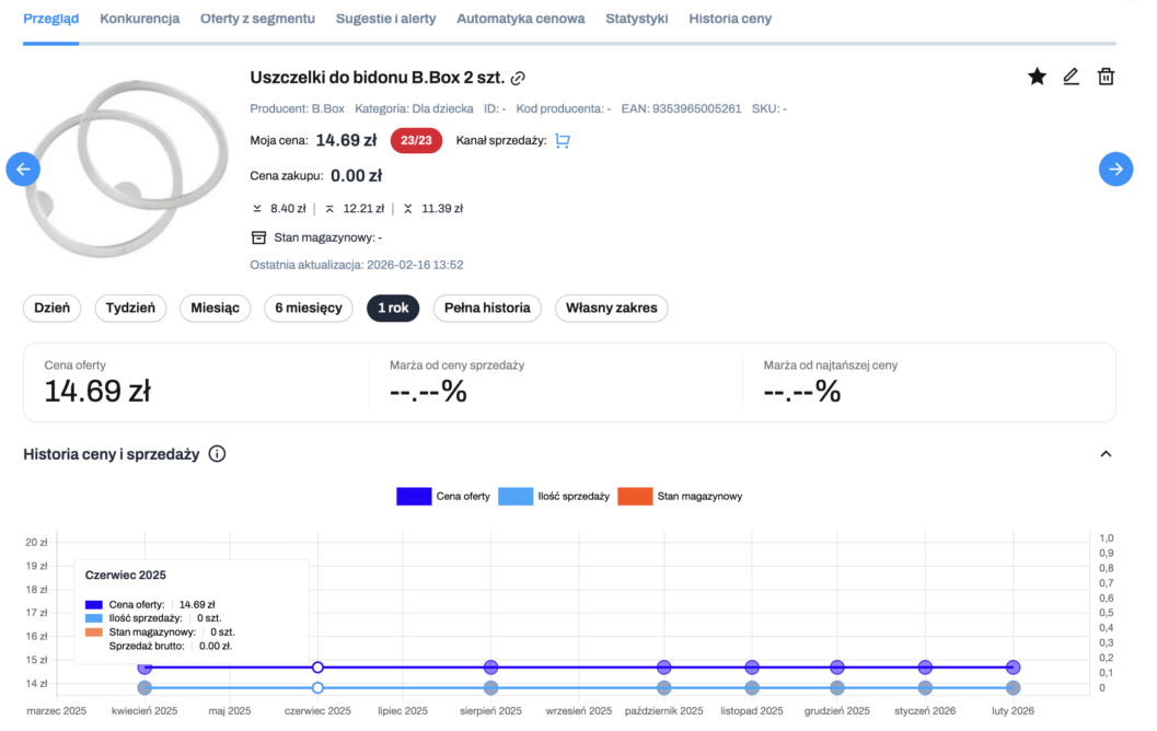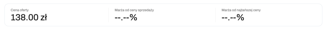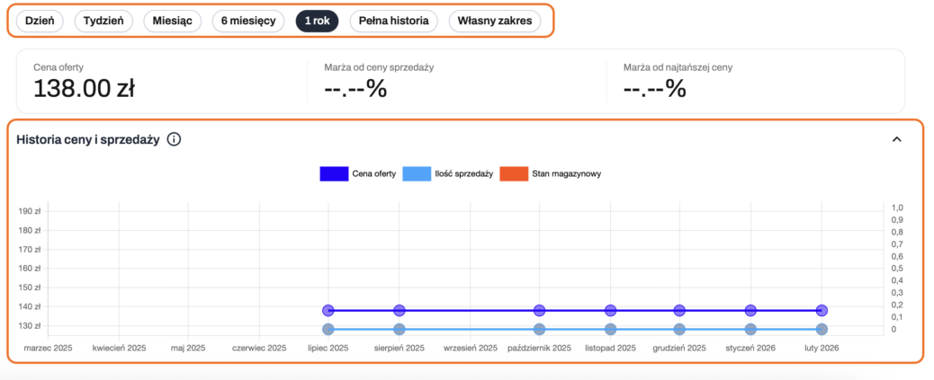 Wybrany zakres czasu wpływa na wartości wyświetlane dla ceny oferty, marży sprzedaży oraz marży względem najniższej ceny konkurencji.