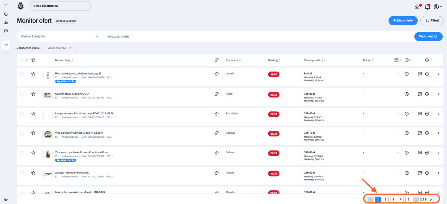 W prawym dolnym rogu znajdziesz informację o liczbie stron z ofertami. Każda strona zawiera 50 ofert, ostatnia może zawierać ich mniej.