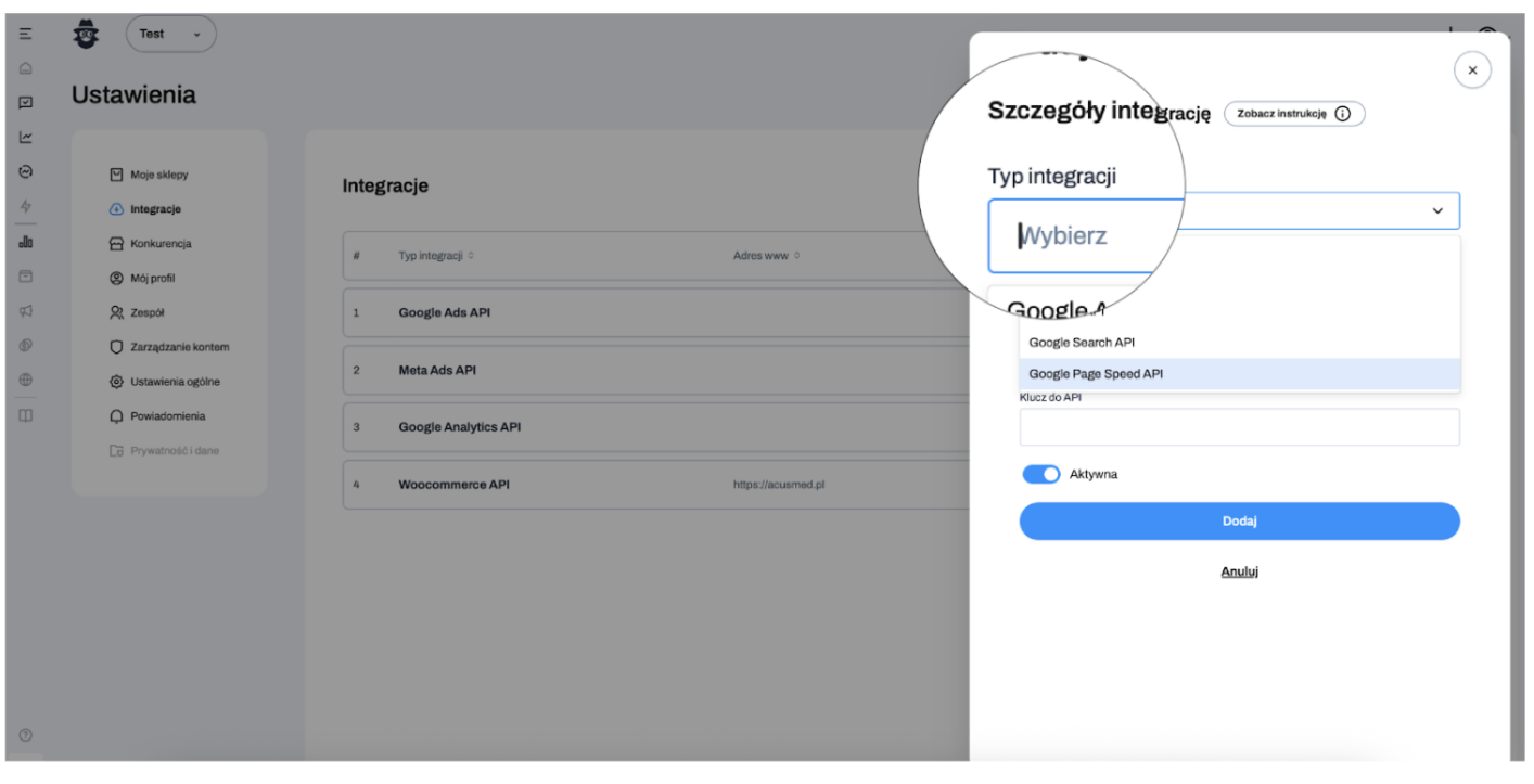 1. Zaloguj się do Berryboo i wejdź na Ustawienia >> Integracje >> u góry po prawej kliknij na Dodaj nową integrację >> Typ integracji >> Wybierz: Google PageSpeed API z rozwijanego menu: