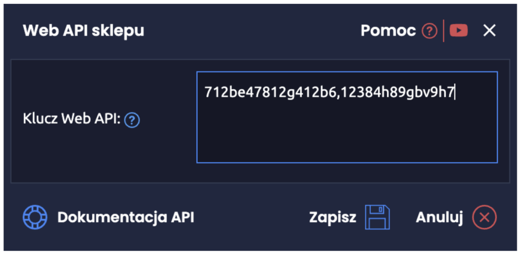 3. Otworzy się okienko z konfiguracją kluczy API. Skopiuj klucz wyświetlony w tym okienku. Jeżeli klucz jest już używany przez inną integrację, po przecinku dodaj nowy klucz składający się z losowych znaków i cyfr.