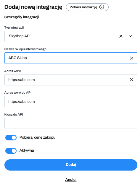 7. Kliknij Dodaj nową integrację i wybierz typ integracji: Skyshop API: