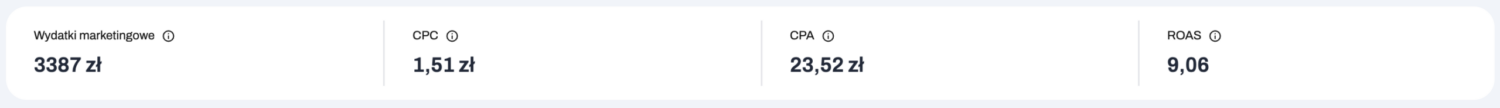 W pierwszym raporcie możesz sprawdzić sumę wydatków marketingowych oraz kluczowe wskaźniki, takie jak Cost per Click (CPC), koszt akcji (CPA) i ROAS per wybrana kampania. Przy każdej metryce dostępne są tooltipy z dodatkowymi informacjami.