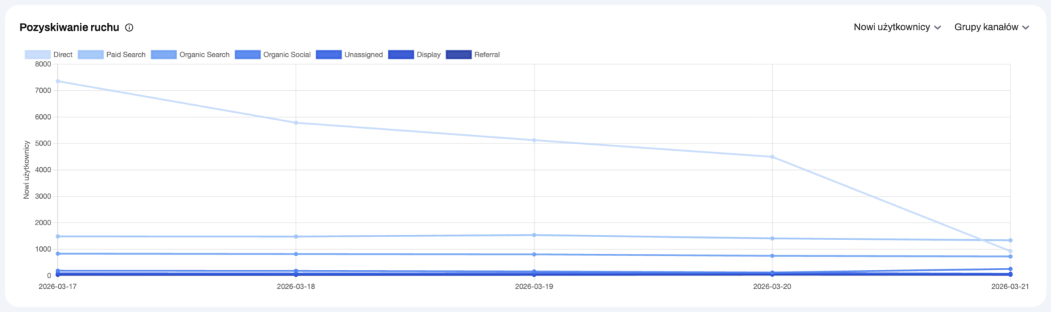 - różnymi poziomami grupowania (np. kanały, kampanie, źródło/medium).
