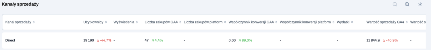 Dzięki temu możesz porównywać dane w jednej tabeli: np. CPC z Google Ads zestawione z liczbą konwersji lub sprzedaży z GA4. System pokazuje dane obok siebie, aby ułatwić ich weryfikację i porównanie między źródłami.
