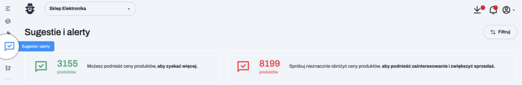 W pionowym, lewym menu wybierz sekcję Sugestie i alerty. Znajdziesz tu kafelki prezentujące najważniejsze rekomendacje oraz informacje analityczne dotyczące Twoich ofert w kontekście ofert monitorowanych dla Ciebie konkurentów. Dane są pogrupowane według kategorii, co ułatwia szybkie zidentyfikowanie ofert wymagających uwagi i podjęcie odpowiednich działań.