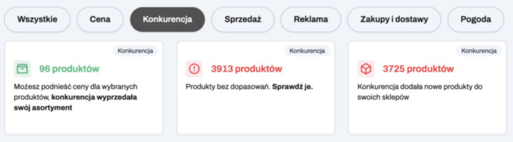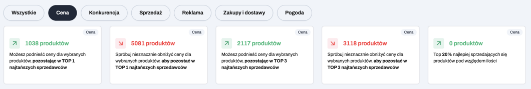 Kafelki w kategorii Cena wskazują oferty, dla których warto rozważyć zmianę ceny w celu poprawy wyników sprzedaży lub zwiększenia marży. Dane będą tworzone w oparciu o sklepy konkurencyjne, które dla Ciebie monitorujemy.