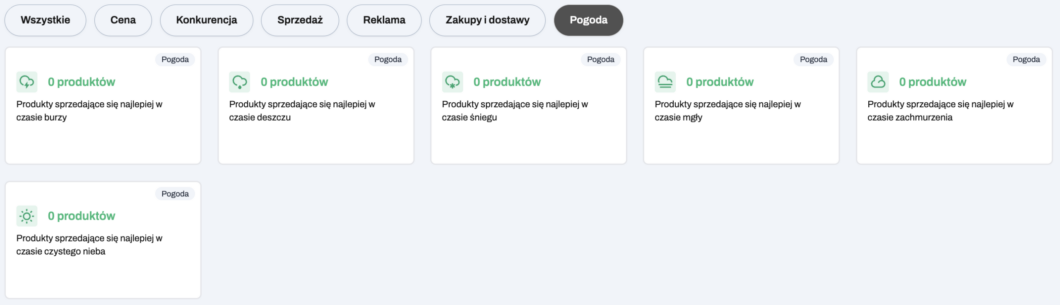W kategorii Pogoda możesz zobaczyć informacje o produktach najczęściej kupowanych w określonych warunkach pogodowych, takich jak deszcz lub burza.