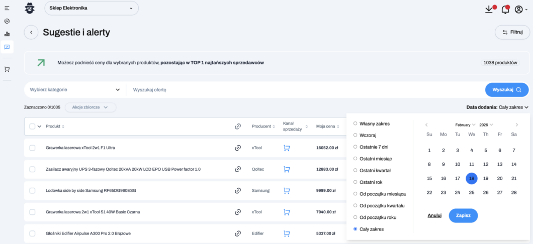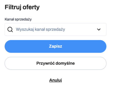 Sugestie i alerty możesz filtrować według kanału sprzedaży, korzystając z przycisku znajdującego się w prawym górnym rogu. Ta opcja jest szczególnie przydatna, jeśli masz więcej niż jedną integrację i chcesz zawęzić widok do wybranego kanału.