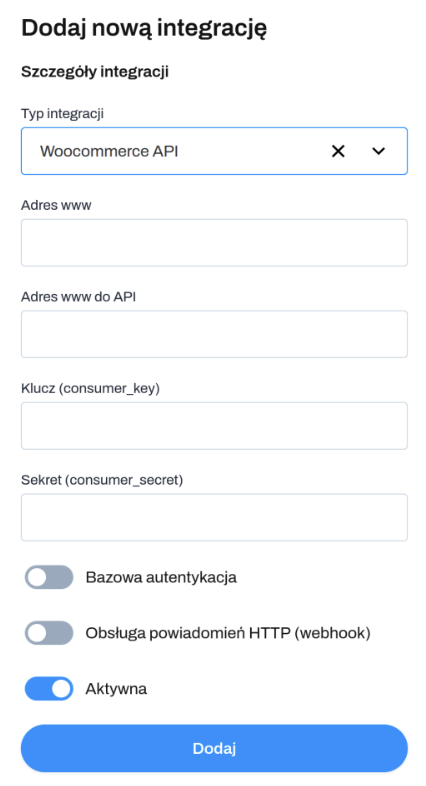 11. Pozostań na zakładce Integracje, kliknij w Dodaj Integrację (prawy górny róg) i uzupełnij formularz:
